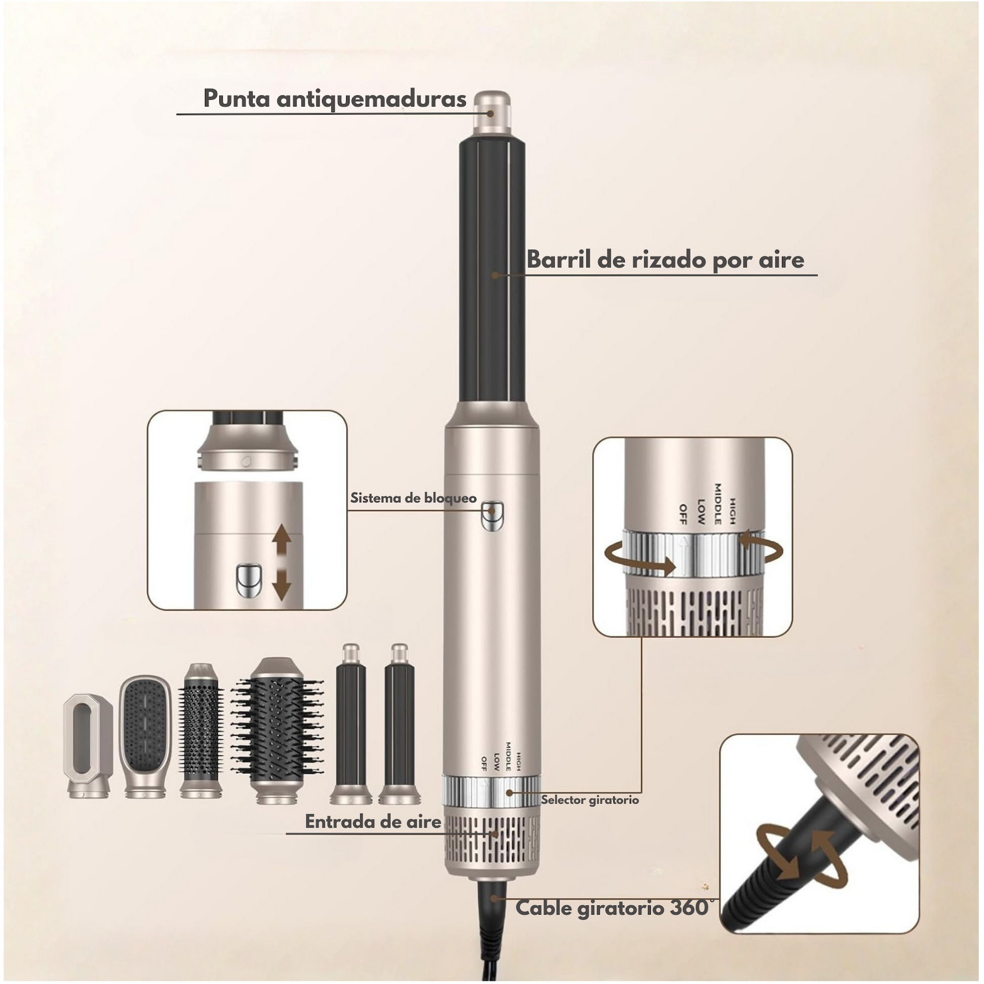 - 💎 Kit completo 6 en 1 — Seca, alisa, riza y da volumen con un solo dispositivo multifuncional. Perfecto para casa, viajes, bodas y uso diario.